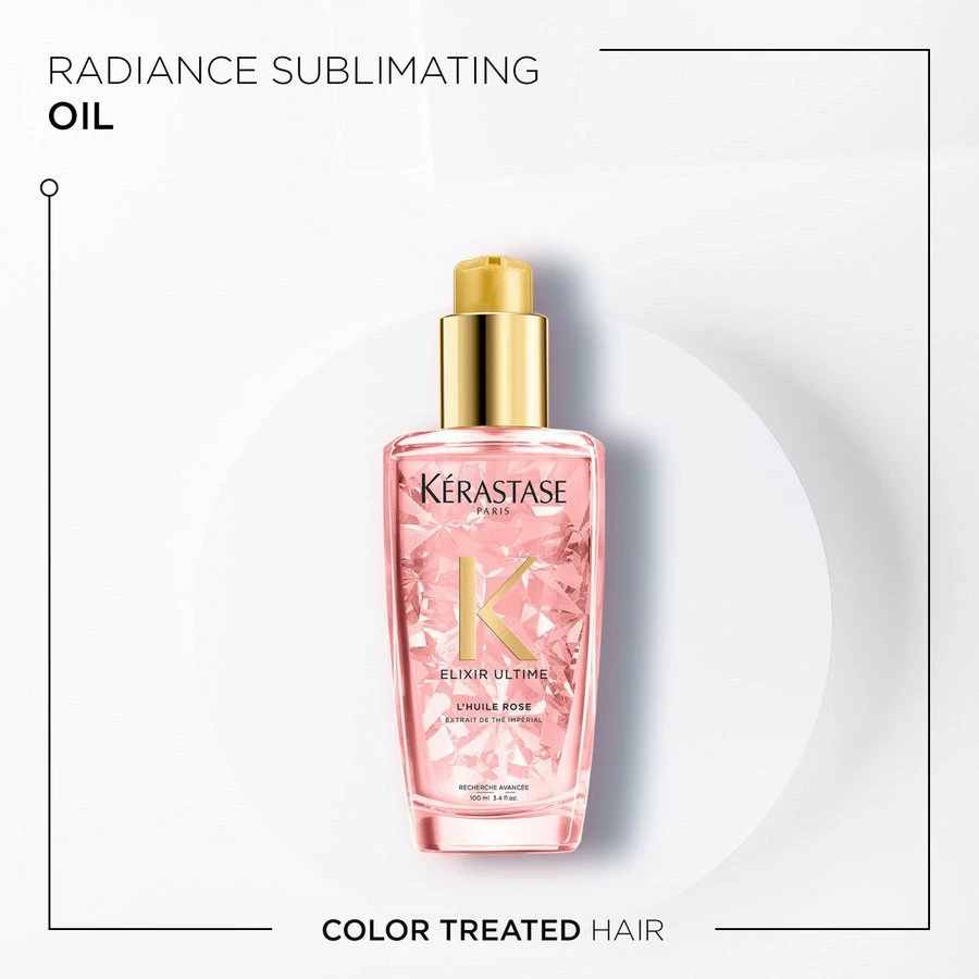 Kérastase Elixir Ultime L’Huile Rose er en elixir som gir en fantastisk pleie til ditt hår. Håret blir mykt og glansfullt uten å bli tynget ned. Inneholder en eksepsjonell kombinasjon av ekstrakt fra Imperial te og en rik blanding av argan, kamelia og maisskimolje. Håret føles velpleid med en nydelig duft og strålende glans.