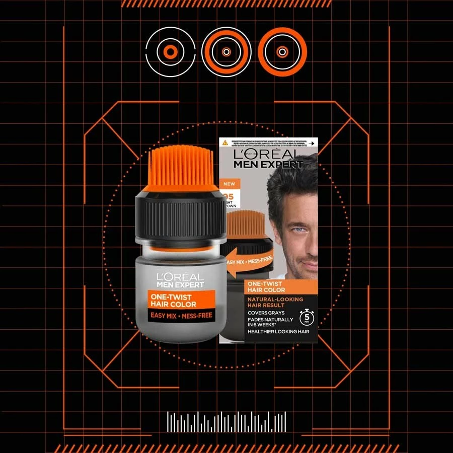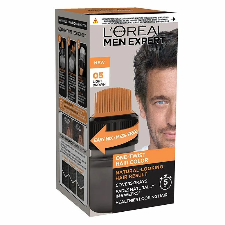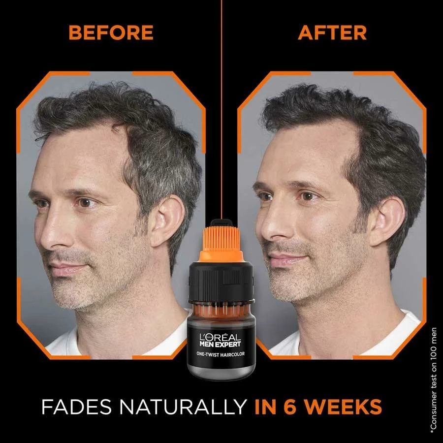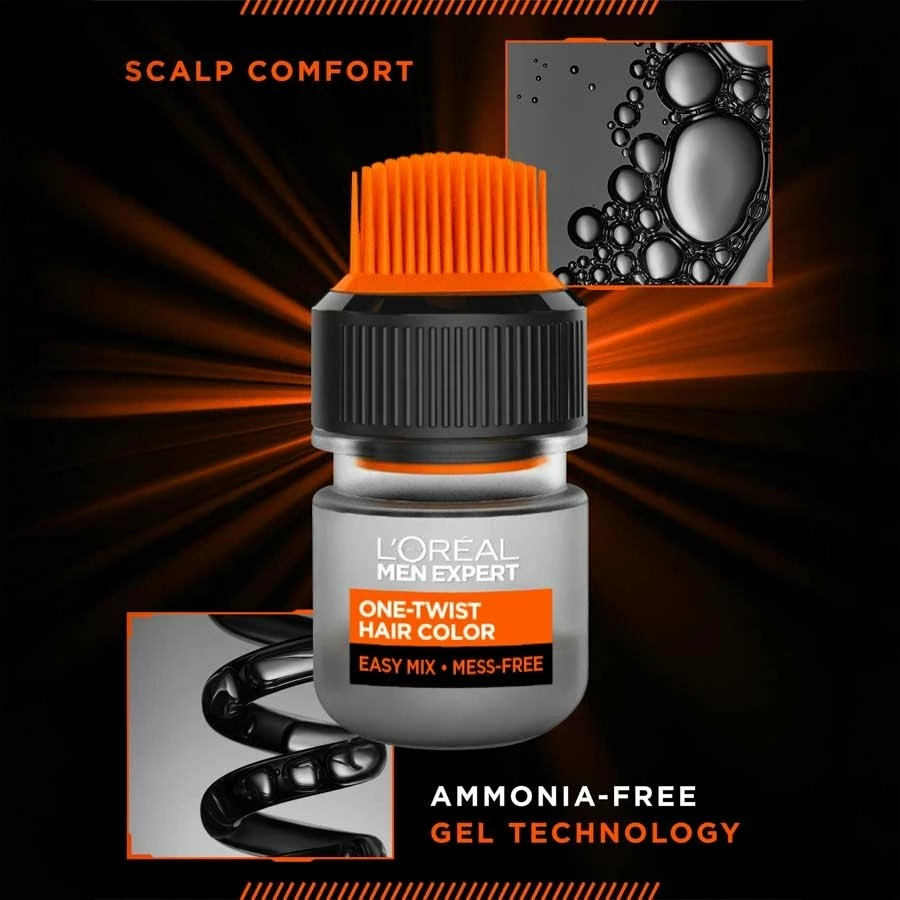 One-Twist Hair Color er en hårfarge utviklet til menn. Gir et resultat som ser naturlig ut og dekker grå hår på bare 5 minutter. En innovativ One-Twist-teknologi for enkel påføring uten søl. Fargen smelter sammen med de grå hårene dine for et naturlig resultat.